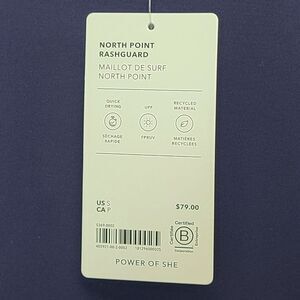 NWT Athleta Women' S North Point Rashguard Navy Blue Long Sleeve Fitted Swim Top. Swim, surf, stand-up paddleboard, and all water sports. Recycled H2EC0 fabric is smooth and sleek with powerful stretch. Back pull zipper for easy on/off. Recycled Nylon/Lycra® Spandex. UPF 50+ (excellent uv protection). Quick drying. LYCRA® XTRA LIFE™ SPANDEX: Long-lasting Lycra® Xtra Life™ fabric stretches and moves with her.
