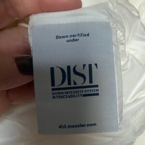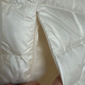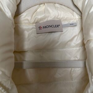 Elegant ivory puffer by Moncler. Features a sleek design with a high collar. Ideal for chilly days.