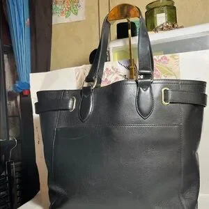 Elegant black leather shoulder bag. Features sturdy handles and sleek design. Ideal for daily essentials.