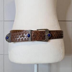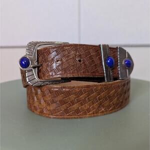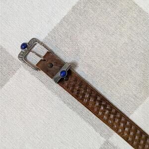 Vintage woven texture leather belt with blue stone silver buckle