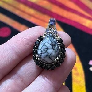 Stunning sterling silver pendant with white buffalo turquoise, tanzanite and black onyx settings. Made for Chuck Clemency. Marked 925 STS. Measures about 1 1/4” tall. Like new condition.