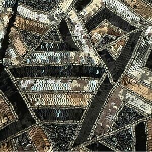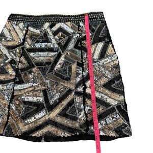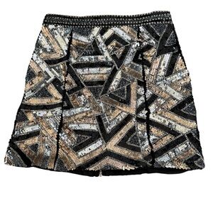 Eye-catching mini skirt with intricate sequin patterns. Features black, silver, and gold tones. Great quality.
