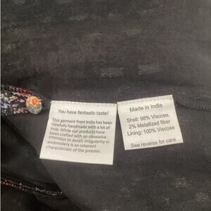 Feature: Black Graphic Print Lame / Plunging Neckline / Ruched Skirt / Lightly Padded Shoulders / Long Slightly Sheer Sleeves / Gold Tone Metallic Thread throughout / Hidden back zip and loop button closure / Lined / Made in India