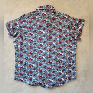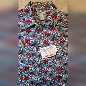 BRAND NEW with tags (NWT) Wrangler Wrancher Shirt! This vibrant short-sleeve button-down features a gorgeous, colorful all-over floral print on a deep navy/blue background.