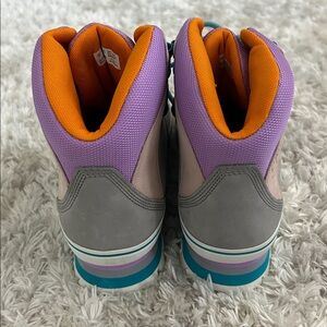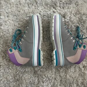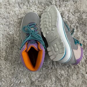 Durable Timberland boots in gray and purple. Teal laces and orange interior add vibrant style. Never worn!