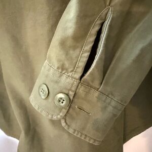 Casual forest green shirt jacket. Features button closures and dual chest pockets. Ideal for layering.