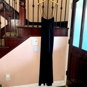 Chic black maxi dress with thin straps. Perfect for elegant occasions. Simple yet sophisticated design.