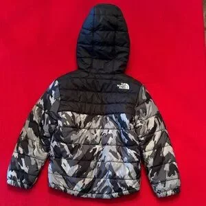 The North Face jacket with black and gray camouflage pattern. Features a hood and zip closure. Reversible. Size XS or 6