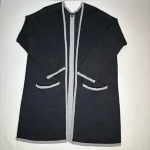 Charcoal and light gray contrast border, open front, long line, easy fit.