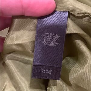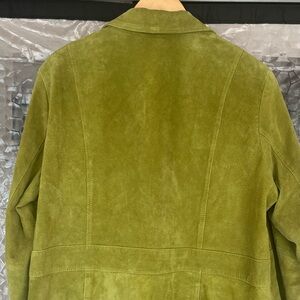 Check out this women’s Y2K suede light green blazer jacket. It features a classic design with a modern twist: front button closure, pleated pockets and a waistband look. It’s ideal for adding a retro vibe and a pop of color to your wardrobe. Lined. Vintage inspired Liz Claiborne. Like-new condition except for a missing button on one cuff. Lime green suede leather. Size 2X