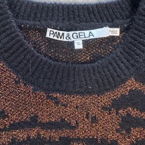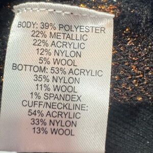 Colors are black and a bronze/gold Metallic shiny thread on the gold parts Crew neck Body is 39% polyester 22% metallic 22% acrylic 12% nylon 5% wool. This Pam & Gela Metallic Gold Black Tiger Sweater. Like New.