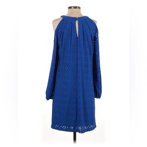 Chic long sleeve dress with cut-out shoulders. Eyelet pattern adds elegance. Perfect for any event.