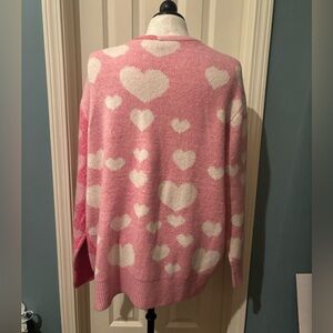 Charming two-toned pink cardigan with white heart design. Soft and cozy for any occasion. Brand new with tags. So cozy! Would be perfect for Valentine’s Day! Size medium. Oversized fit!