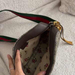 Stylish Gucci crossbody with iconic pattern. Features green and red strap. Perfect for any outfit.