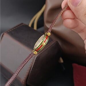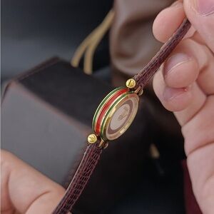 Stylish Gucci watch with a gold case and maroon strap. Ideal for any event.