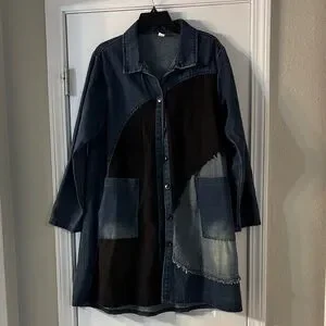 Discover the perfect blend of style and comfort with this chic denim patchwork coat. Featuring a unique combination of black and blue, this coat is ideal for casual outings. Its fashionable design ensures you stand out in any crowd.