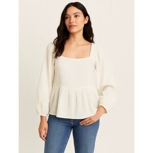 Lightweight and effortlessly feminine, this Madewell long sleeve blouse features a soft gauze texture and a square neckline. Made from 100% cotton, it has a relaxed, flowy silhouette with a subtle peplum hem and billowy sleeves with elastic cuffs. Perfect for layering or wearing solo during transitional weather.