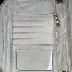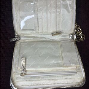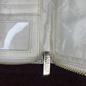 Sleek Versace clutch in metallic silver. Features a stylish chain wristlet. Ideal for elegant outings.