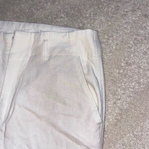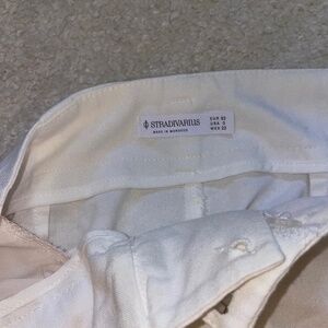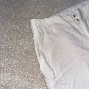 Lightweight white trousers with a straight-leg cut and subtle structure. Mid-rise fit with belt loops, front zipper and hook closure, and side pockets. Size US 0 / EUR 32.