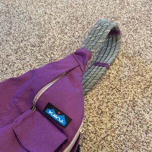 Vibrant purple Kavu sling bag. Features front pocket and adjustable strap.