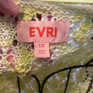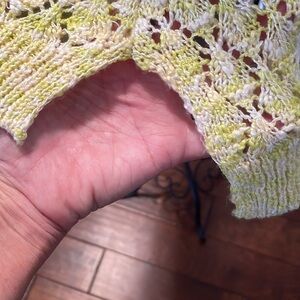 Ladies, yellow and white pullover sweater. Beautiful crochet look in body of sweater. Would have to layer over a tank top. Scoop neckline with three-quarter sleeves. Sides slits for comfort material is 100% acrylic. No stains or pulls in fabric. In excellent pre-loved condition. all items in closet are buy one get one half off. Bundle to save! Check for free items listed randomly in my closet.