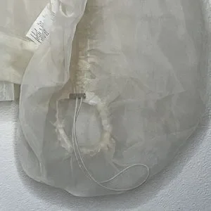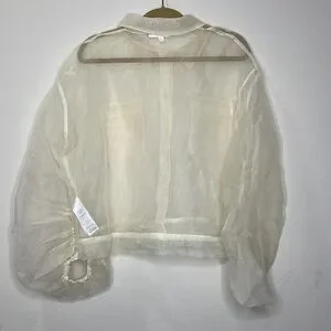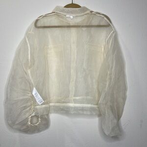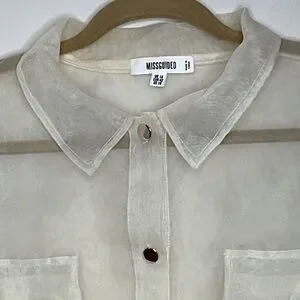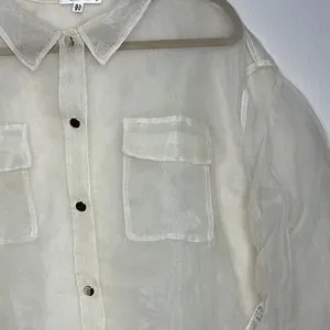 Elegant sheer blouse with button-up front. Features two chest pockets.