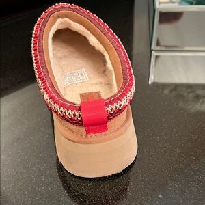 UGG Tasman II slip-on chestnut suede, red pattern trim platform slippers. Worn twice.