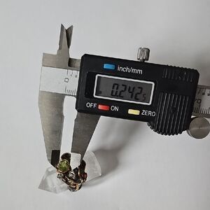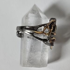This adjustable ring features a stunning combination of gold and black tones, adorned with faceted peridot, white topaz, and garnet stones. Perfect for adding a touch of elegance to any outfit. Clear quartz generator not included.