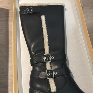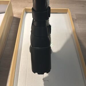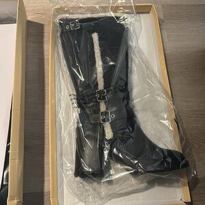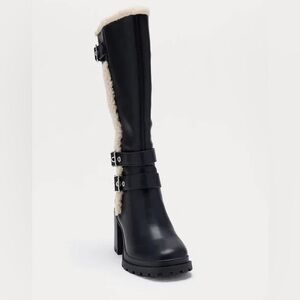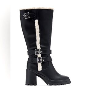 Stylish black heeled boots. Features cream trim and buckle accents. Perfect for any occasion.