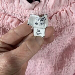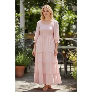 This Women's Dress in pink Swiss dot Milkmaid style with a square neckline and tie closure is perfect for various occasions such as travel, weddings, parties, or casual wear. The dress features ruffle accents, layered design, a bow, and tiered details, making it a charming and feminine choice. Made of lightweight cotton fabric, this midi-length dress with 3/4 balloon sleeves offers a fit & flare, A-line, and babydoll style that exudes a romantic and cottagecore vibe. Ideal for summer, fall, and spring, this dress from Crown & Ivy is a must-have for any fashion-forward woman in size XL.