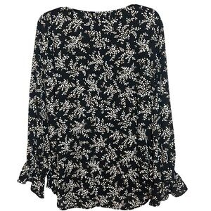 Chic blouse with a black base and white floral pattern. Perfect for any occasion. Gathered sleeves at the wrist with a flare after the elastic. Excellent preowned condition.