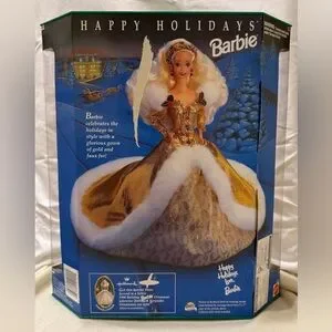 Celebrate the holidays with this classic Happy Holidays Barbie from 1994! Featuring an elegant, festive gown with beautiful holiday detailing, this doll is part of the early and highly collectible Happy Holidays Barbie series. A wonderful piece of 1990s Barbie nostalgia, perfect for collectors, gifting, or holiday display.
