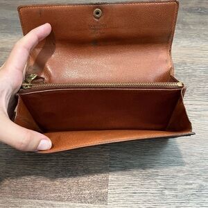 The item shown is an Authentic Louis Vuitton Sarah wallet in the classic Monogram coated canvas. This elegant, envelope-style wallet is a popular and functional accessory known for its spacious interior and durability. Made in Spain.