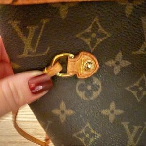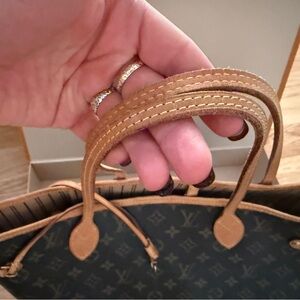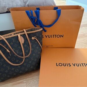 Neverfull MM tan Louis Vuitton tote with iconic monogram. Dark brown with tan accents. Used. All original paperwork included. Good condition.