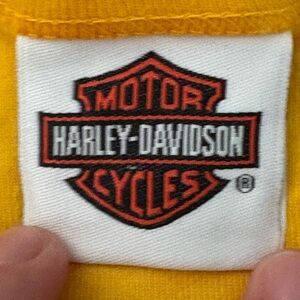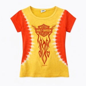 Harley-Davidson tie dye graphic tee with bold flame/longhorn front graphic and Rossiter’s Harley-Davidson (Sarasota, Florida) dealer back graphic with palm tree. Fun Y2K moto/biker vibe—great with denim, cargos, or layered under a jacket.