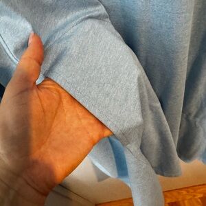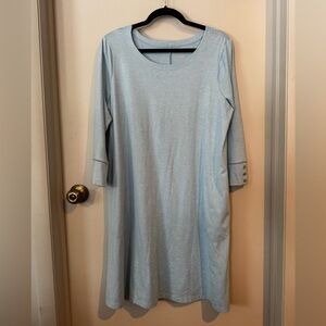 Chic light blue dress with long sleeves. Fabric is cozy, soft, and stretchable! Two pockets! Washable! Perfect like new condition. Good button detail at cuffs. Size XL. Length 37”, P2P 23”, hip 50” with more with stretch.