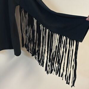 - Elevate your style with this chic black long sleeve top featuring trendy fringe details. Perfect for any occasion.
