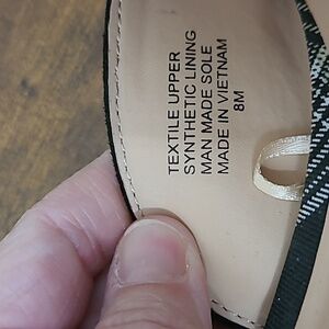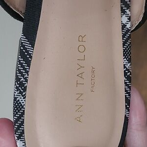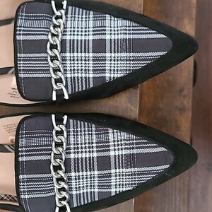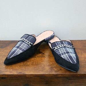 Ann Taylor Factory Black Suede Loafer Mules with Plaid detail & chain design size 8.