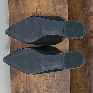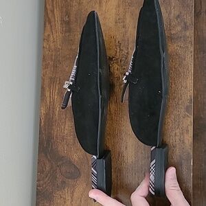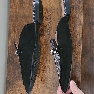 Ann Taylor Factory Black Suede Loafer Mules with Plaid & chain design size 8