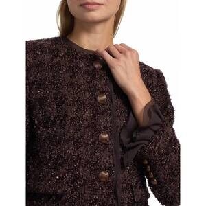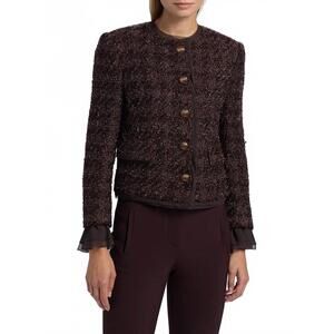 Thanks for checking out our fabulous Posh closet!! All of our items are new with tags! Never worn or used <3 - Composition: 58% Polyamide, 42% Acrylic Lining: 100% Cupro - Description: A casual yet cool jacket that every closset needs.Introducing the Veronica Beard Audrina Metallic Tweed Jacket in Dark Currant, a standout piece perfect for the contemporary wardrobe. This women's jacket flaunts long sleeves and a fitted, cropped length of 20.375 inches, crafted from a luxurious blend of 58% Polyamide and 42% Acrylic, with a lining made from 100% Cupro. Its collarless neckline and button closure are complemented by removable peekaboo ruffled cuffs and sheer trim, making it ideal for stylish occasions like dinner parties or New Year's Eve celebrations. Originating from a brand celebrated for understanding feminine tailoring, this jacket should only be dry cleaned to maintain its elegant appeal. - Because all of our merchandise is brand new and often times in original packaging, extra photos or measurements cannot be provided - Heads-up that color shades may vary due to the photo lighting - We always put the color name in the title - All items are final sale - Thank you so much for shopping! We appreciate you :)