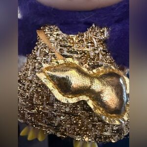 The doll is dressed in a metallic gold, 3D butterfly-inspired outfit and includes a gold, violin-shaped accessory.