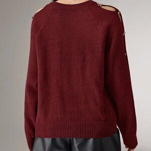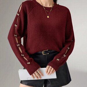 Elevate your late style with this burgundy casual sweater, featuring a round neckline and raglan sleeve design. Made with rib-knit fabric for a cozy feel, it includes a metal bow details on the sleeves for added elegance and fun. Perfect for everyday wear, this loose-fit pullover offers a regular hem and long sleeves, keeping you warm and comfortable.