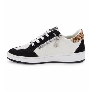 In excellent used condition- WORN ONLY ONCE! Trendy sneakers with black and white design. Leopard star accent adds flair. Perfect for everyday wear. Stylish interchangeable lace sneakers draped in luxe suede and rich calf hair trim. Leather, suede and synthetic with calf hair trim upper Apron toe Side zipper and lace-up vamp Textile and synthetic lining Trim: Real calf hair Padded insole Synthetic sole Fur type: Dyed calf hair Fur. Vintage Havana. Color: Leopard Multi. Size: 12 (Child).