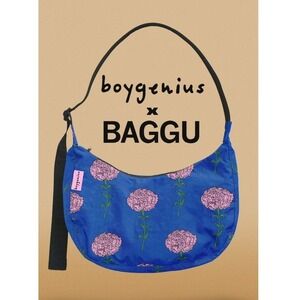 It's the rare and coveted boygenius x BAGGU medium nylon crescent bag, brand new with tags! Never used. The bag is blue with pink carnations printed all over, a nod to the lyric "In the next one, will you find me? I'll be the boy with the pink carnation pinned to my lapel..." from "We're In Love" on "the record" album. If you love the boys, or someone you love loves them, this is the bag you need!