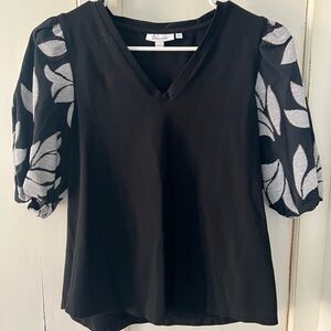 Chic black blouse by Chico's. Features striking silver leaf-patterned sleeves. Voluminous sleeves punctuate the sleek, dark canvas with a bold floral leaf print, adding a touch of artistry and flair. The flattering V-neckline enhances the silhouette, offering a touch of elegance. Wear it to a business casual meeting, a stylish brunch with friends, or a cozy date night.