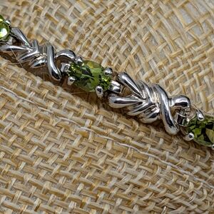 This gorgeous vintage bracelet is crafted in solid 925 sterling silver and set with vibrant peridot gemstones – the August birthstone. Each oval peridot is prong‑set between beautifully sculpted leaf‑shaped links, giving the piece a botanical, organic look. The bracelet measures approximately 7 ½ – 7 ¾ inches (see photo with ruler) and weighs a substantial 14.1 grams. It closes securely with a heavy lobster clasp stamped “925.”