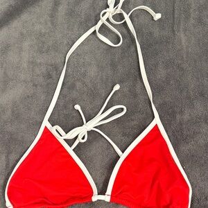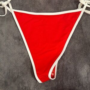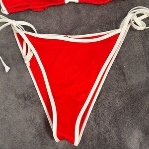 Stylish red bikini set with white trim. Halter toe top with tie back. Side tie bottoms. Perfect for the beach.