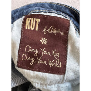 These are pre-owned KUT from the Kloth jeans, size 14. The jeans are made of 99% cotton and 1% spandex. They feature a standard five-pocket design with a zip fly and button closure. The denim has a medium wash with slight fading. The waist measures approximately 16.5 inches across. There are no visible stains, tears, or significant wear. Very minor tiny snags-see photo. Overall, they are in very good condition. Style number KP488MC3N.