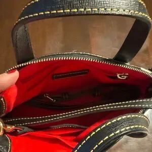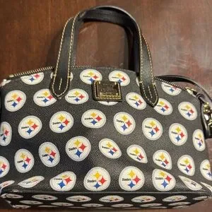 Chic black satchel featuring vibrant team emblems. Perfect for fans. Stylish and durable design.