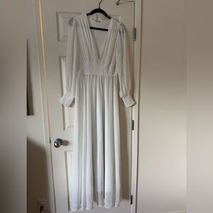 This stunning gown by Baltic Born features a romantic plunge neckline and elegant bishop sleeves, perfect for a bride. Would also be great for maternity, bridal shower, or family photos. The dress is crafted in a soft white hue with a flowing A-line silhouette, offering a timeless and ethereal look for any special occasion. Waistline is stretchy so very maternity friendly! Absolutely beautiful gown.